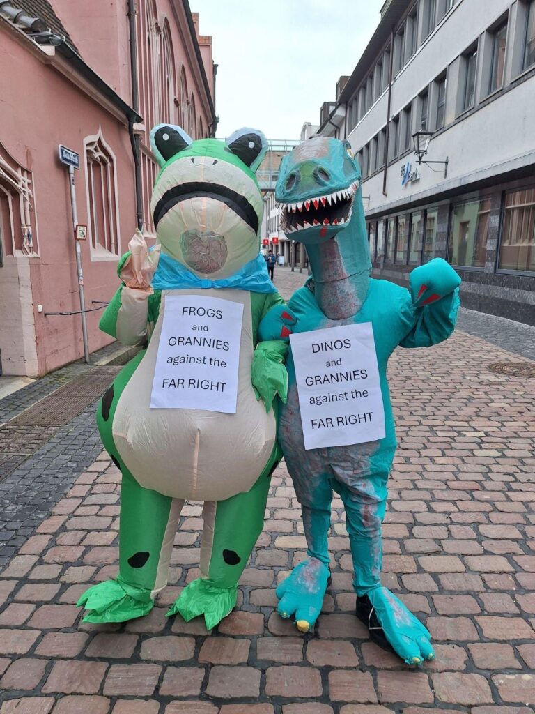 Beim Wahlstand bekamen wir auch Besuch von Frosch und Dino, die mit ihren Plakaten „Frogs and GRANNIES against the FAR RIGHT“ und „Dinos an GRANNIES against the FAR RIGHT“ ihre Solidarität mit den demokratischen Kräften in der amerikanischen Bevölkerung ausdrücken wollten.